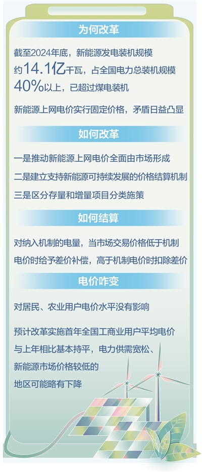 答:改革总体思路是,坚持市场化方向,推动新能源上网电量全面进入市场、上网电价由市场形成,配套建立可持续发展价格结算机制,区分存量和增量分类施策,促进行业持续健康发展。